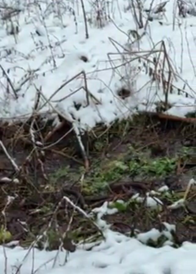 wintry scene. The foreground features snow-covered ground with some bare vegetation peeking through. A small stream or gully runs through the scene. The camera then pans up to reveal a dense forest of tall evergreen trees, their branches heavily laden with snow. The sky is overcast. The video is static and focuses on the natural environment.