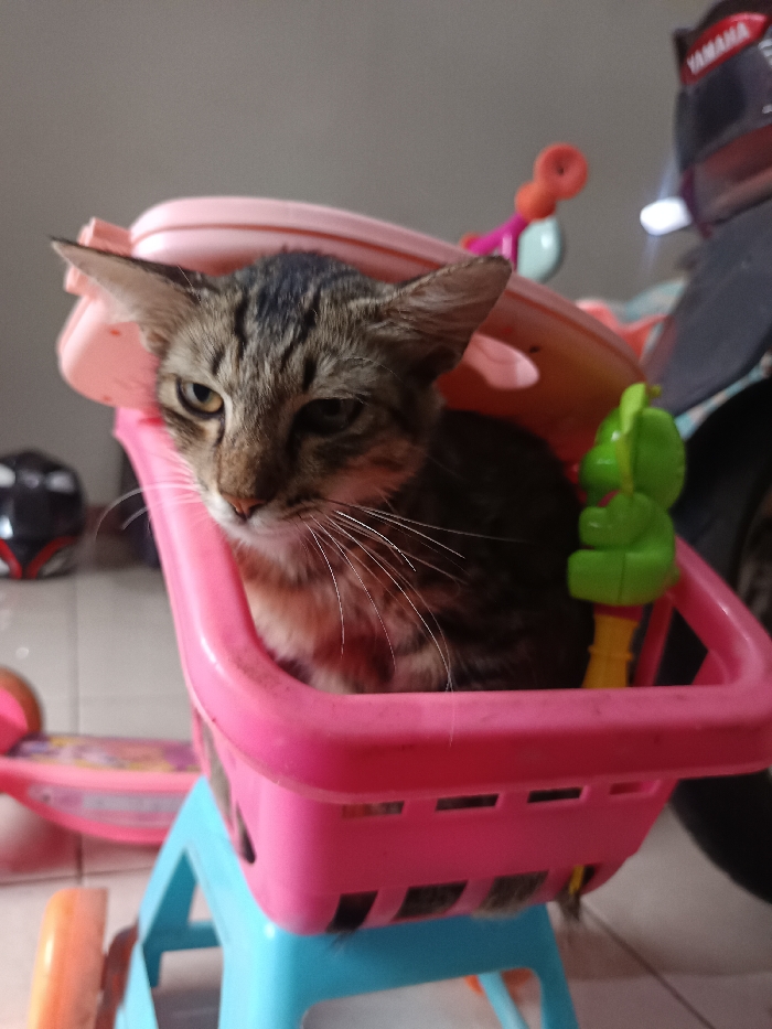 A tabby cat sits inside a pink and blue toy shopping cart, looking slightly disgruntled. The cart is part of a larger toy, possibly a scooter, with orange wheels visible in the foreground. A green and yellow toy is attached to the cart's side. In the background, there's a black and red helmet and part of a Yamaha scooter. The flooring appears to be tiled.