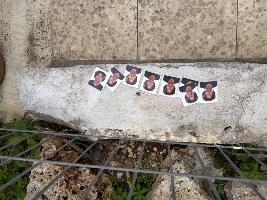 The scene depicts an outdoor ground-level view in Holon, Israel. Seven small, rectangular color prints, each featuring the headshot of the same individual, are arranged in a slightly irregular, staggered line along a weathered light-grey concrete slab. The individual shown has dark skin, short, dark, curly hair, and a subtle smile, wearing a dark-colored top. The concrete slab forms a vertical boundary within the frame. To its immediate left, a patch of uncultivated ground is visible, containing light-colored, irregular rocks, sparse green plant growth, and exposed soil. A metal mesh fence, characterized by a square grid pattern, partially occupies the far-left foreground, bordering the uncultivated area. To the right of the concrete slab is a paved surface constructed from light-brown and beige speckled square tiles. A small portion of a terracotta pot's rim is visible in the upper right corner of the paved area.