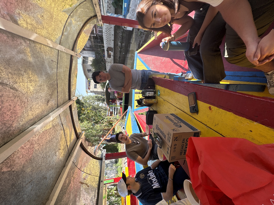 A group of five individuals on a brightly colored, covered boat enjoy each other's company. Two people are visible at the top, a man stands behind them. Below them, two men are seated near a Corona beer box. The boat features vibrant red, yellow, and blue colors. Buildings and greenery are faintly visible in the background. The overall image conveys a sense of relaxed camaraderie.