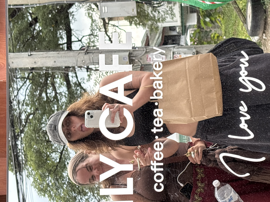 A mirror selfie captures two Caucasian females reflected in an outdoor setting within Chiang Mai City Municipality, Thailand. The individual on the right, appearing younger with long brown hair, wears a dark baseball cap, a black crop top, and dark wide-leg pants. She holds a light-colored smartphone to take the photograph, obscuring part of her face, and sticks out her tongue in a playful expression. A brown paper bag is draped over her left arm, and tattoos are visible on her left arm. The individual on the left, appearing older, wears a brown sleeveless top, a patterned headscarf, and a maroon skirt with embroidered trim. She holds a thin, gold-colored cylindrical object to her mouth, from which smoke or vapor emanates, and displays a playful grimace. She wears a gold-colored ring on her right hand, and a brown shoulder bag is visible by her side, along with a plastic water bottle. White text is affixed to the mirror's surface, reading "LY CAFE" (partially visible), "coffee • tea • bakery", and "I love you" in cursive script. The reflected background shows an urban landscape with large green trees, a grey utility pole densely covered with wires, and hints of buildings. A green striped object and a black tire are visible on the ground to the far right of the reflection.