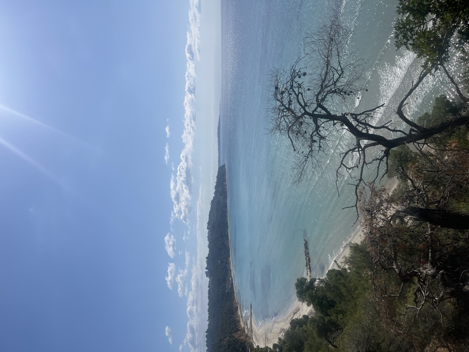 The image displays an elevated panoramic coastal view within the Kassandra Municipal Unit, Greece. The scene is dominated by a clear blue sky with scattered white cumulus clouds across the mid-horizon, and a strong sun flare emanating from the upper right quadrant. The Aegean Sea occupies the middle and right portions, exhibiting a gradient from light turquoise near the shore to a deeper blue further offshore, with visible small waves reflecting sunlight. A curving, light-colored sandy beach stretches along the left side of the frame, appearing uninhabited. This beach is bordered by a densely forested green hillside composed of pine-like trees. Several short, dark rock breakwaters extend from the beach into the water at various points along the shoreline. In the immediate foreground, particularly on the right, a prominent, gnarled tree with bare branches and what appear to be pine cones stands silhouetted against the sparkling water. No people or artificial structures beyond the rock breakwaters are visible.
