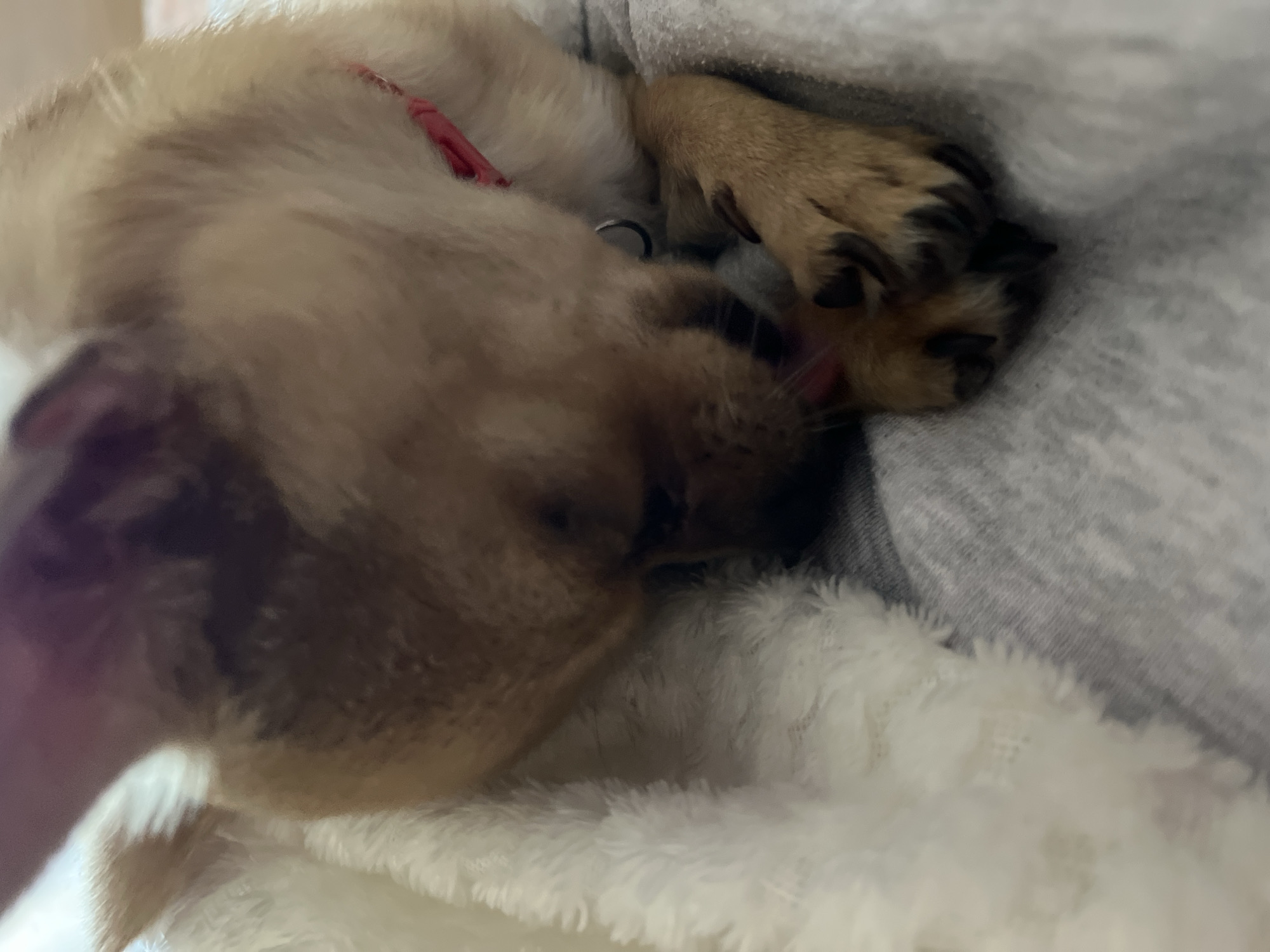 An indoor, close-up scene in General Toshevo, Bulgaria, depicts a small, light-brown dog, possibly a Chihuahua, in the act of grooming. The dog is positioned with its head down, actively licking its front left paw, with its pink tongue partially visible against its paw. It wears a thin red collar, partially visible around its neck, which features a small, metallic tag or buckle. The dog's dark claws are visible against the lighter fur of its paw. The animal is resting on, and partially enveloped by, a soft, white, high-pile fluffy blanket or fabric, which occupies the left side of the frame. Beneath and to the right of the dog, a grey, subtly patterned fabric, consistent with a blanket or garment like sweatpants, is visible. The lighting is soft and diffuse, indicating an interior setting.