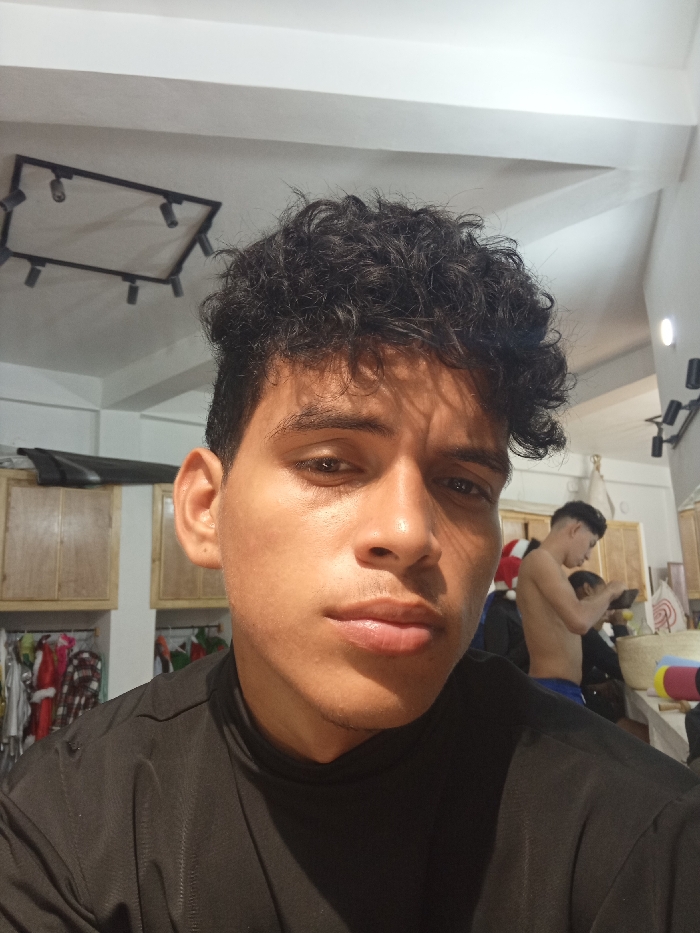 A young man with curly black hair and dark eyes takes a selfie. He wears a black shirt. The background reveals an indoor setting, possibly a shop, with cabinets and items including a red and white garment. Another person, shirtless and appearing younger, stands in the background, seemingly looking at a device. Overhead, there's a rectangular light fixture. The lighting suggests artificial sources within the room.