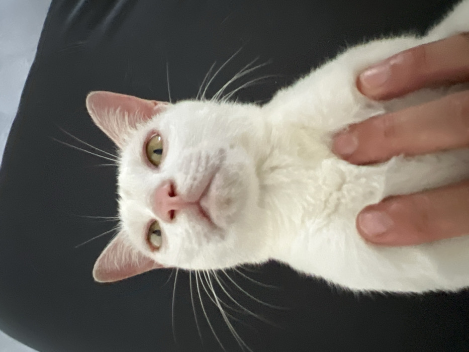- "A close-up, low-angle image depicts a white domestic cat indoors in Cam Đức, Vietnam" by FM-gZMgt2, licensed under CC BY 4.0
