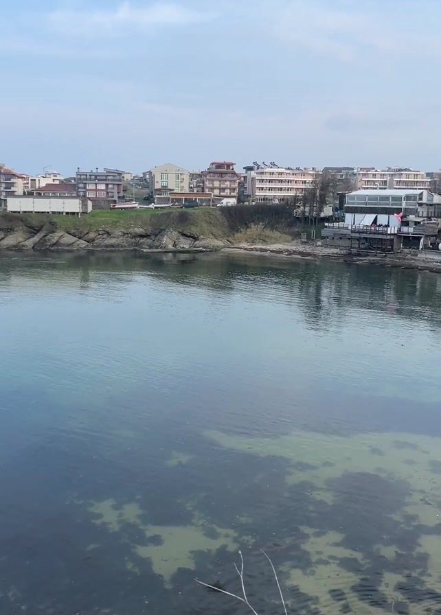 calm body of water with buildings visible in the background along the coast. The water is clear enough to see the bottom, which has a pattern of dark and light patches. On the left side of the frame, there's a small island with a large white cross. The sky is overcast, suggesting it might be a cloudy day. There is sparse vegetation and bare branches visible in the foreground. A fishing rod is noticeable on the left side of the frame.