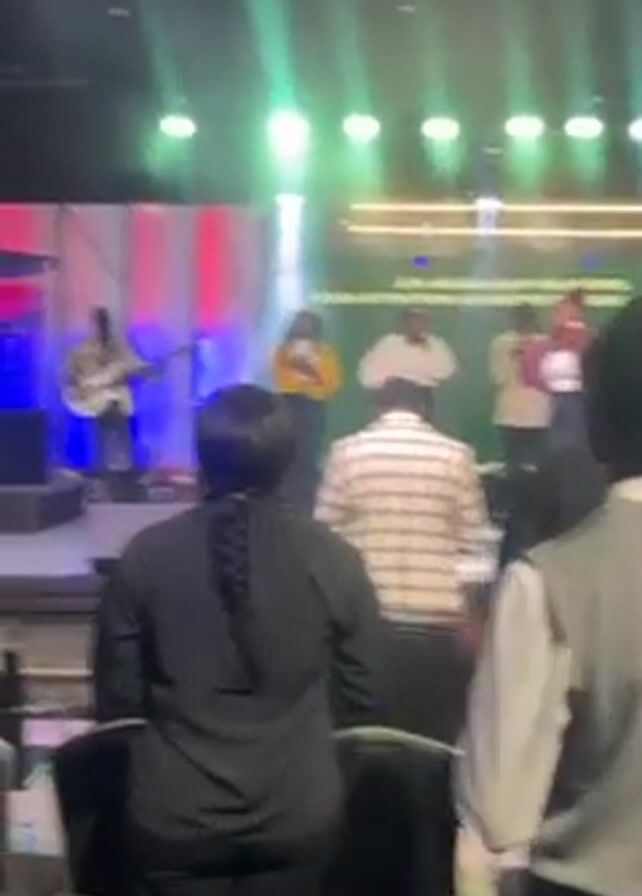 stage with a band performing, likely in a church or similar venue. The band includes a drummer in a glass enclosure, a bass guitarist, and several singers. The stage is lit with green, blue, and red lights. The audience is visible in the foreground, with people standing, some with their hands raised, as if in worship. The camera moves slightly, offering different angles of the stage and audience. A screen displaying text is visible above the band.