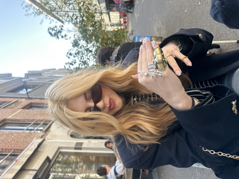 A young blonde female is seated outdoors in Antwerp, Belgium, under clear daylight conditions. She wears dark oval sunglasses, a dark blue blazer with brass-colored buttons, and a striped top. Multiple silver necklaces, including one with a small heart pendant, are visible. Her fingernails are uniformly painted white with black polka dots. Her right hand, held in front of her, is adorned with numerous rings, including a multi-charm silver ring on the index finger and a large, elongated, metallic ring with green elements on the middle finger. Her left hand displays a simple gold band. She is looking downwards at her hands, which are positioned as if showcasing the jewelry. The background on the left features a reddish-brown brick building with windows and an outdoor heater, along with two blurred individuals. The background on the right includes green and yellow foliage, a section of pavement, a blue pole-mounted sign, and orange construction barriers further in the distance.