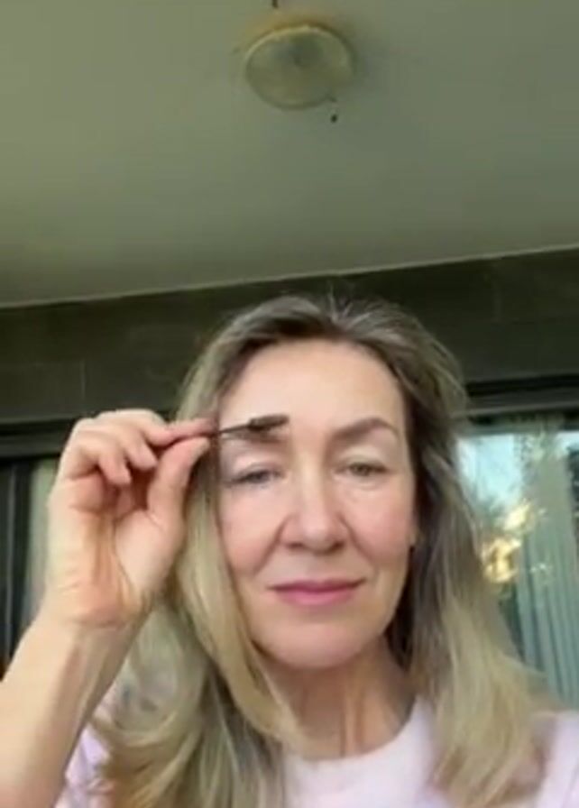 A woman applies eyebrow makeup in a video. The woman has medium-length blonde hair and is wearing a pink sweatshirt. She is using an eyebrow brush to apply makeup to her eyebrows. She looks directly at the camera. The background shows a covered patio. There is a light fixture hanging from the ceiling and sliding glass doors.