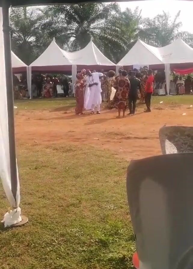 gathering of people in an outdoor setting. Several white tents are set up, likely for an event. A group of people is gathered in the center, with one person dressed in white facing the others. The ground is a mix of dirt and grass. The video appears to be shot from within a covered area, possibly another tent, with a chair visible in the foreground. Palm trees are visible in the background.
