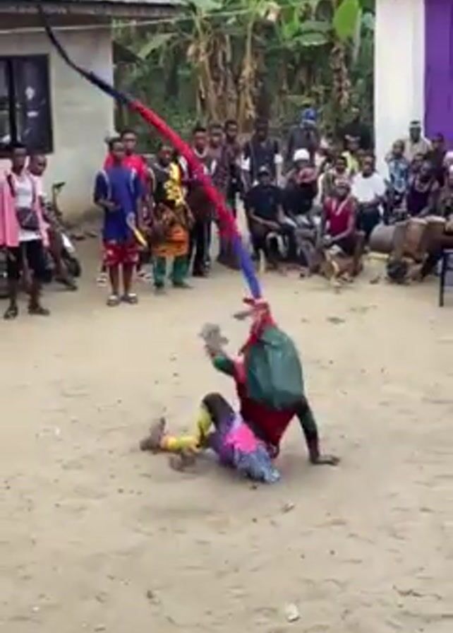 In an outdoor setting, a person clad in a full-body costume, adorned with red, green, blue, and yellow colors, performs acrobatics while spinning a long, striped wand. They move low to the ground, using their hands and knees. A crowd of onlookers, mostly male, surrounds the performer, some sitting on chairs, others standing. The setting is a village-like environment, with simple buildings, trees, and a motorcycle visible in the background. Music plays, and the atmosphere suggests a cultural performance or celebration.