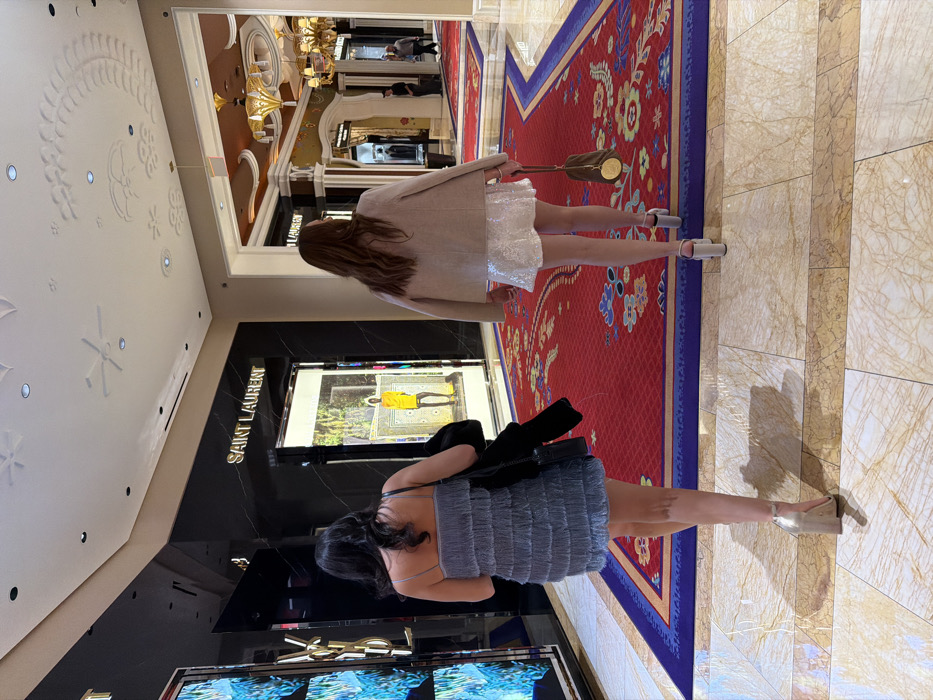 Two women stand in a luxury shopping mall. One wears a light beige blazer over a white sequined dress, carrying a brown handbag. The other wears a blue dress and carries a black jacket over her shoulder. They stand on a red patterned carpet with blue borders, adjacent to a marble-tiled floor. Behind them is a Saint Laurent store with a display window. Ornate ceiling designs and chandeliers are visible in the reflection above.