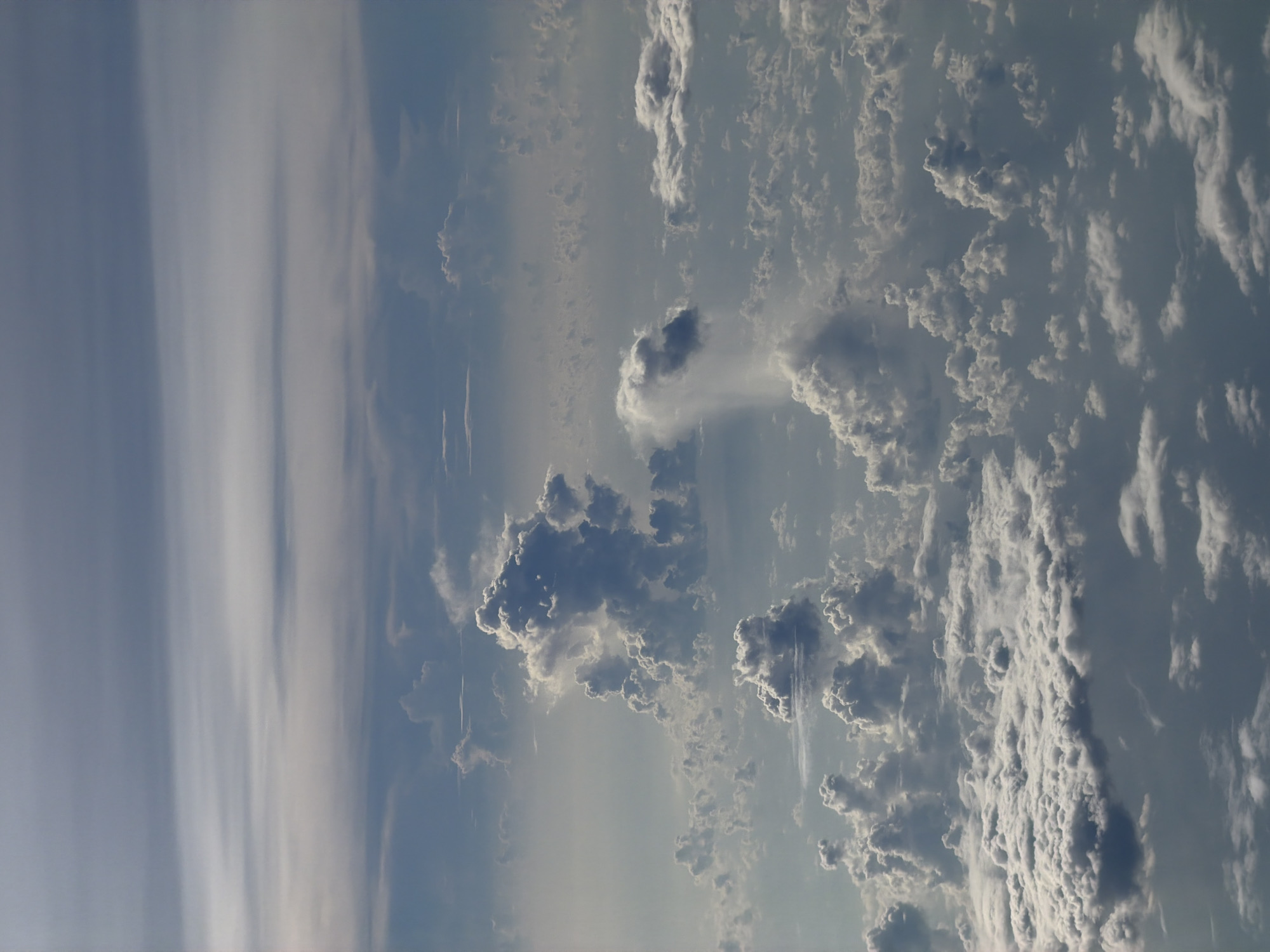 n aerial view of clouds. The sky is a mixture of blue and gray. Various cloud formations are visible, including cumulus and cirrus clouds. The image does not depict any specific location or city. It does not contain any people, subjects, or objects other than clouds. No actions or interactions are visible. The environment is the atmosphere.