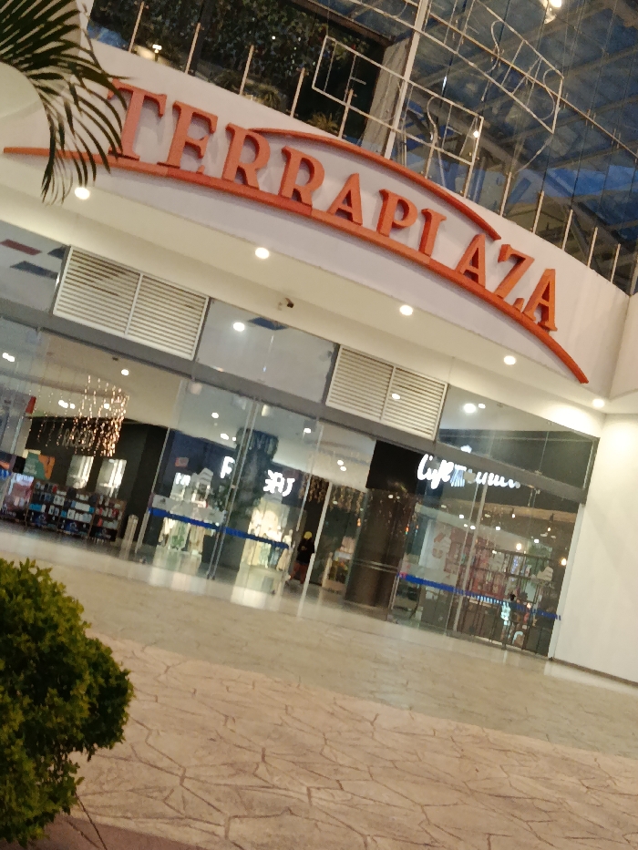 entrance of "TERRAPLAZA" mall. The mall's name is displayed in large orange letters above the entrance. The entrance is composed of glass doors and windows. The floor is made of patterned tiles. A green bush is in the foreground on the left side. A palm tree's leaves are visible in the top left corner. The mall's interior lights are visible through the glass.