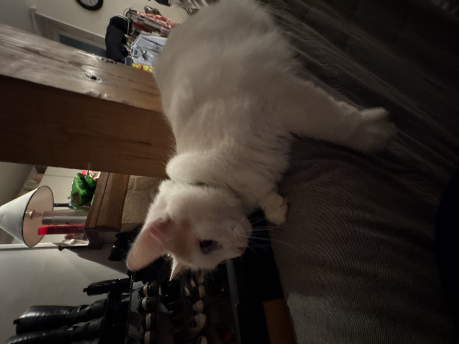 - "A fluffy white cat rests on a person's lap, its head hanging slightly over the edge of a wooden table" by FM-yD2SV2, licensed under CC BY 4.0