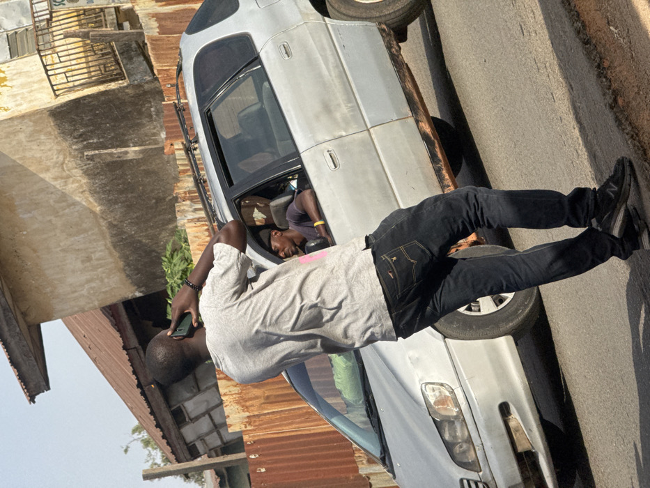 This image depicts a daytime scene on a paved road in Jos, Nigeria. In the foreground, a male, seen from behind, is standing with his weight shifted to his right. He wears a light grey short-sleeved t-shirt, dark blue jeans, and dark athletic shoes (New Balance brand visible on the right shoe). He holds a dark green or black smartphone to his right ear, appearing to be engaged in a phone call. A dark beaded bracelet is visible on his left wrist. To his left, a silver-colored minivan or SUV (resembling a Toyota model) is stationary or moving slowly. The vehicle displays signs of wear, including rust along the lower body panels and minor dents. Its roof rack is visible. Inside the vehicle, a male is seated, visible through the open front passenger window. He wears a dark t-shirt and a dark baseball cap, with a yellow bracelet on his right wrist, and is looking forward or slightly towards the left. The background features a rusty, brown corrugated metal fence. Behind the fence, several structures are visible, including a weathered building with faded, dirty yellow/tan walls, an upper-floor balcony with a yellow/brown metal railing, and a partially visible white sign with dark text, possibly indicating a "SCHOOL" or similar establishment. Another structure with a reddish-brown corrugated metal roof is partially seen. The scene is illuminated by bright daylight, casting distinct shadows.