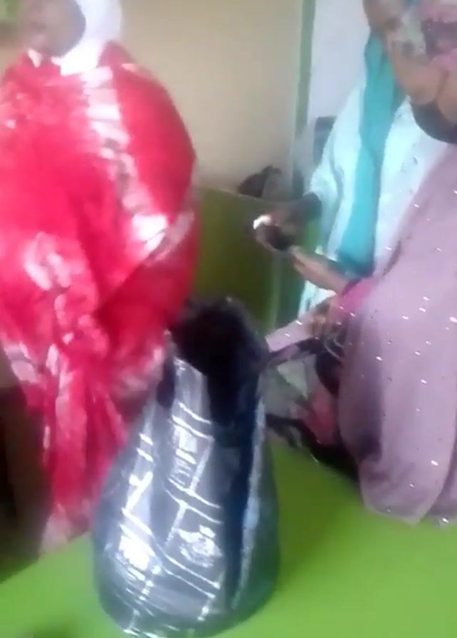 Here is a detailed description of the video: The video shows three women in what appears to be an indoor setting, possibly a store or workshop due to the presence of a green table or counter. The first woman, standing to the left, is wearing a white hijab and a red and white patterned shawl or wrap. The second woman is seated at the table and wearing a light blue hijab with a matching light blue top, as well as a patterned skirt. She holds a small, silver object in her hand, possibly examining or working on it. The third woman, also seated, is wearing a pink or light purple shawl or robe with what appears to be beaded or sequined accents. Her head is covered with a patterned headscarf. She is looking at a smartphone. On the green table, there is a black bag with white geometric patterns and the letters "TVA BAG". There also appears to be a silver object, possibly a tool or piece of hardware, lying near the edge of the table. The background is plain, with a light-colored wall and some glimpses of green structures or furniture, possibly shelves or cabinets. The lighting seems to be from overhead, casting soft shadows in the room. The camera is at a medium distance from the subjects and there is slight movement, possibly due to handheld filming.