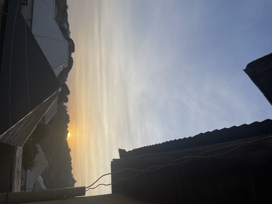 The image presents a panoramic view of an urban landscape in Jos, Nigeria, observed at either sunrise or sunset from an elevated vantage point. The scene is dominated by a warm, golden light emanating from the sun, visible as a distinct circular disc low on the horizon, partially obscured by distant hills. In the immediate foreground, dark, corrugated metal roof structures are visible in the upper-left and upper-right corners, suggesting the eaves of the building from which the photograph was taken. On the right, a vertical dark structure, possibly a wall or pillar, is present, with two white electrical wires hanging loosely downwards. The midground features numerous residential buildings, characterized primarily by their corrugated metal roofs, which vary in color from dark grey/black to lighter silver/white. These structures are nestled among scattered large, rounded rock formations, which are a prominent geological feature of the Jos Plateau. The background consists of a series of rolling hills, also adorned with similar rock outcrops and sparse vegetation, silhouetted against the bright horizon. The sky exhibits a gradient, transitioning from a light blue at the top to a warm orange and yellow closer to the horizon, with faint, wispy cloud formations extending across the expanse. No individuals or active interactions are discernible within the frame.