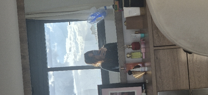The image displays an indoor scene in Tixeraïne, Algeria, captured as a selfie reflected in a mirror. A person, identified as female, with light brown hair pulled back, is visible from the chest up, wearing a dark long-sleeved garment. She holds a smartphone to her face, obscuring it, as she takes the photograph in the mirror. The mirror is mounted above a light-colored wooden dresser featuring two visible drawers. On the dresser surface, various objects are arranged: multiple perfume bottles of different colors (gold, green, red) and designs, a white pump bottle, a golden fan-shaped decorative item, small pink cylindrical containers, a white tube of "CLINIQUE" branded lotion, and a dark rectangular object. To the far left, a black-framed picture or mirror with a pink mat is present. To the right, a small blue and white electric fan with visibly rotating blades is positioned on the dresser. Behind the person, through a multi-paned window with dark frames, an outdoor view is discernible. The sky is partly cloudy with blue patches. Distant buildings and subtle mountainous terrain are visible on the horizon. A light-colored curtain partially covers the window on the right side.