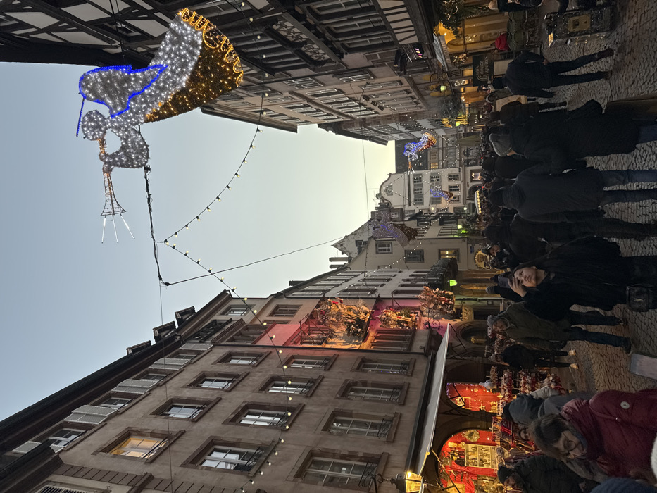 The image captures a bustling pedestrian street in Strasbourg, France, during what appears to be the Christmas season