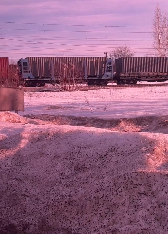 freight train moving from left to right across the frame. The train consists of several container cars, carrying various cargo containers. A large snow bank is in the foreground. The sky is pinkish, suggesting either dawn or dusk. Wires are visible above the train. Vegetation is visible on the side of the tracks, including some bare trees. The overall setting is a snowy, possibly rural or suburban landscape.