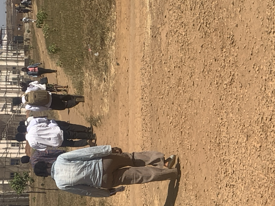 A line of people walks along a dirt path next to a construction site. The individuals wear varied attire, including light-colored shirts, dark pants, and at least one backpack. The path is uneven with small stones and dust. To the left, unfinished buildings stand with scaffolding. The background shows sparse vegetation under a bright, overcast sky.
