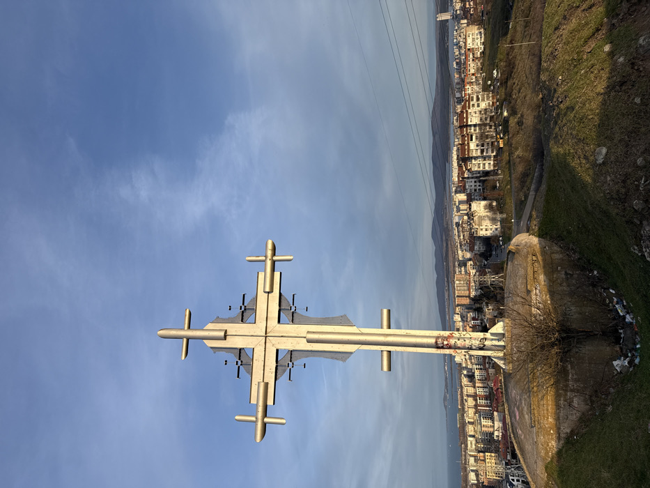 The image depicts a panoramic view of the city of Burgas, Bulgaria, seen from an elevated position. The dominant subject is a large, metallic, multi-segmented cross positioned centrally in the foreground. This cross features a main vertical beam and a main horizontal beam, both constructed from a combination of silver-toned and possibly gold-toned cylindrical and rectangular elements. Each of the four main ends of the cross extends into a smaller, cylindrical, cross-like projection. The lower section of the main vertical beam displays red and black graffiti. The cross stands on a weathered, circular concrete base atop a grassy hill. At the immediate base of this concrete structure, a small, leafless tree or bush is visible, and an accumulation of litter, including plastic bags and other debris, is present in a small depression on the adjacent grassy slope. Below the hill, the urban landscape of Burgas spreads out, characterized by numerous multi-story residential and commercial buildings. Beyond the city, a significant body of water, consistent with the Black Sea or Burgas Bay, is visible, extending towards distant landforms identified as hills or mountains on the horizon. Multiple utility lines stretch horizontally across the mid-ground. The sky is partly cloudy with patches of clear blue. The scene is illuminated by natural light, casting long shadows, suggesting either early morning or late afternoon. No individuals are present, and no active interactions are depicted.