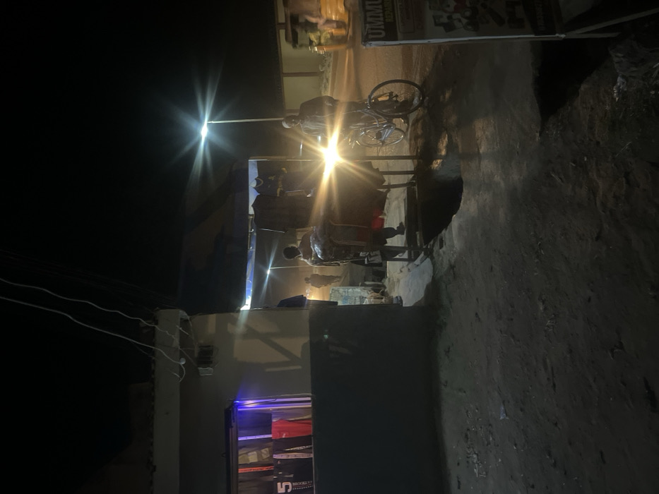 A nighttime scene depicts a street corner with a small vendor stand illuminated by a bright overhead light. People gather around the stand, one with a bicycle beside them. The background is blurred due to the low light, and a building with a lighted window is visible on the left. The road surface appears rough and uneven, suggesting a less developed area. A sign with the word "UMMU" is partially visible on the right.