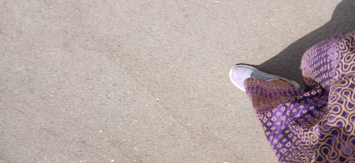 The image depicts a ground-level view in Unguwan Sanusi, Nigeria, focusing on the lower portion of a person's body. The individual wears a flowing purple garment, likely a long skirt or wide-legged trousers, adorned with a repeating light brown/tan geometric pattern. A light gray/lavender sneaker with a white sole is visible on the person's right foot; the left foot is mostly obscured by the fabric. The setting is an outdoor paved surface, appearing as light gray asphalt or concrete with fine speckling. Strong, direct sunlight is indicated by a distinct shadow cast by the person's right leg and foot, extending towards the lower right of the frame. No other individuals or objects are present in the visible area.
