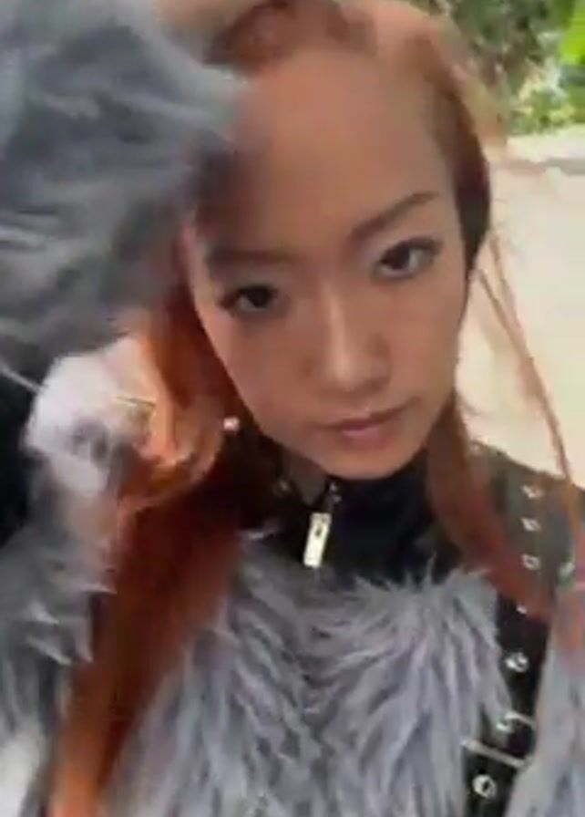 woman with light skin, brown eyes, and orange hair, standing outside on a sidewalk. She is wearing a gray fur-trimmed jacket over a black top with silver accents. The woman looks at the camera and touches her hair. Behind her is a street with cars, trees, and buildings.