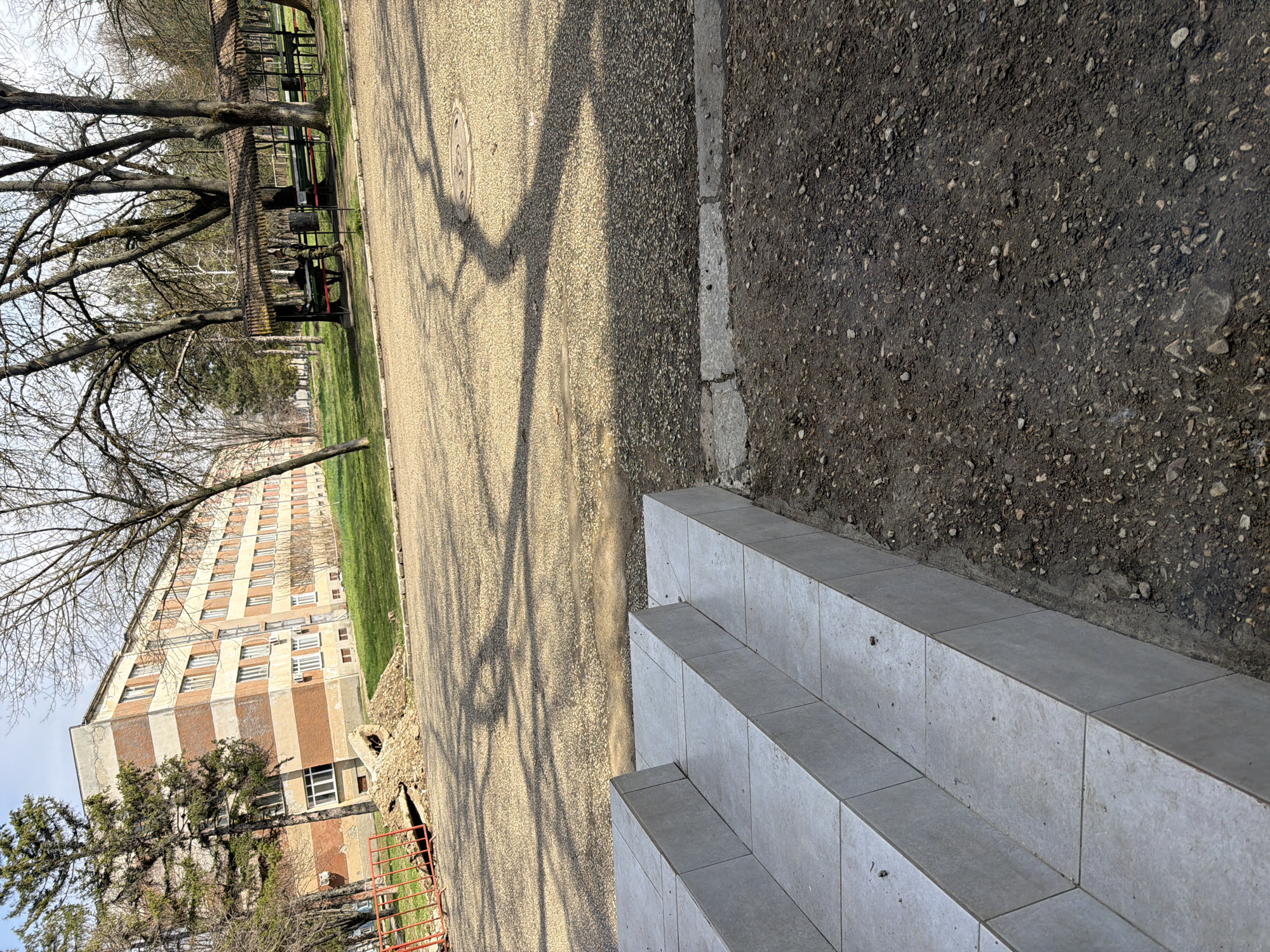 The image depicts an outdoor area in Dolna Mitropolia, Bulgaria. In the immediate foreground, three light-grey tiled steps descend to an unpaved section of dark, rocky soil. Adjacent to this, a light-colored gravel path or road spans the midground, marked by prominent shadows cast from overhead tree branches and a circular metal manhole cover. To the left of the path, a pile of concrete debris and dirt is partially enclosed by red metal safety barriers. The background features a multi-story building with a facade characterized by alternating horizontal stripes of light and reddish-brown material, equipped with numerous windows. Several trees, including bare-branched deciduous specimens and taller evergreens, are scattered across a grassy lawn situated between the path and the building. Beneath a cluster of deciduous trees in the mid-background, multiple open-sided shelters with textured or thatched roofs are visible. Two individuals are seated at a table within the leftmost shelter; one wears dark clothing, and the other appears to wear camouflage or patterned attire. The sky above is clear.