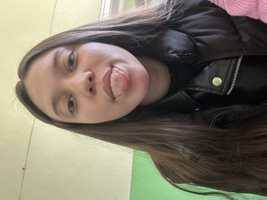 A young woman with long brown hair sticks her tongue out at the camera. She has fair skin and light eyes. The background is a light green wall. She wears a black leather jacket with silver buttons and a black shirt underneath. A glimpse of a pink sweater can be seen on her shoulder. The photo appears to be taken indoors with natural lighting.