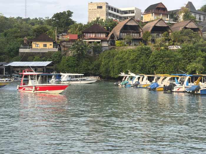 The image displays a coastal scene in Toyapakeh, Indonesia, featuring a body of calm, greenish-blue water in the foreground and a densely vegetated hillside in the background. In the central mid-ground, a red and white powerboat, marked with "ARKEHNA" on its hull, navigates or idles on the water, creating minimal disturbance. To its left, nearer the shore, a larger white passenger boat with a canopy is moored adjacent to a covered dock structure. Along the right-hand shoreline, a series of at least six smaller, white boats, some with yellow or blue canopies, are moored side-by-side. These boats are equipped with outboard motors, several of which are covered with blue or black tarpaulins. The background hillside rises steeply from the water and is heavily covered with green trees and foliage. Various buildings are interspersed throughout the incline. On the left, a single-story yellow building with a dark roof is visible on a terraced foundation. Further right, a traditional two-story building with a red tiled roof stands amidst the greenery. Central to the hillside, a cluster of at least three distinct multi-story structures with prominent thatched, A-frame roofs are visible, appearing as resort or residential units, with a partially visible sign reading "AGUNG VILLA" below them. Higher on the right side of the hill, a multi-story, light-colored concrete building, possibly unfinished, dominates the upper skyline. The sky is overcast with light grey cloud cover. No individuals are present in the image.