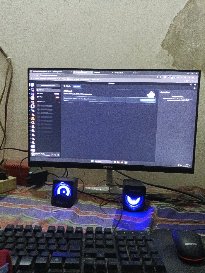 computer setup in a room in Panji, Indonesia. The computer monitor is displaying a web browser window with a Discord chat interface. The monitor is positioned on a desk with a black keyboard and a black computer mouse, both sitting on a striped table cloth. Two black computer speakers with blue LED lights are placed on either side of the keyboard. The background features a white wall with a small patch of peeling paint, indicating a possible previous water damage. There are no people in the image.