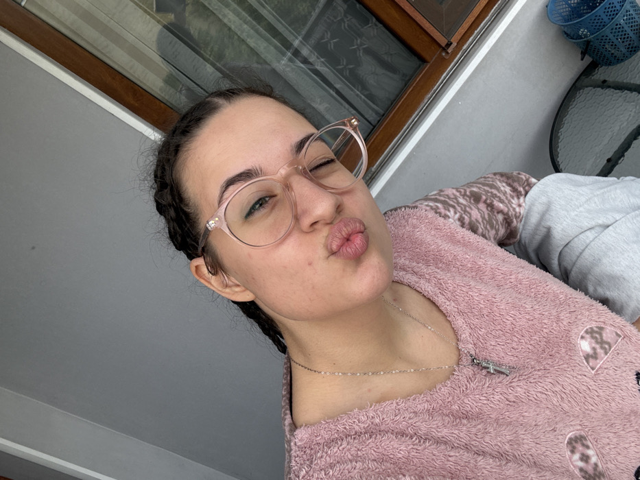 A young female, appearing in her late teens or early twenties, is depicted in a medium-close-up selfie, captured from a slightly upward angle