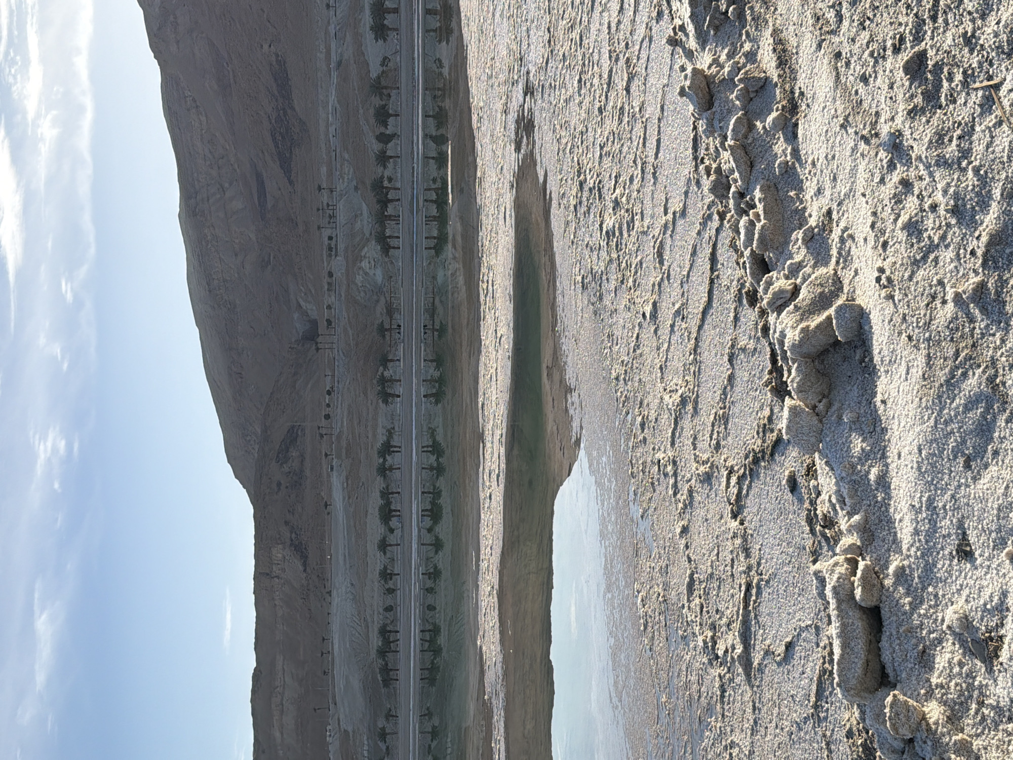 This vertical landscape photograph depicts a saline environment located within the Tamar Regional Council, Israel. The foreground is dominated by extensive, irregular formations of white and off-white salt crystals and deposits, exhibiting a rough, lumpy texture across a parched ground. Beyond the salt flats, a shallow body of water occupies the midground, reflecting the clear blue sky and distant features. A distinct horizontal line of numerous, uniformly spaced palm trees is visible on a terraced, barren embankment situated across the water, with their inverted reflections clearly visible on the water's calm surface. Further in the background, a range of large, arid, and rocky mountains with visible geological stratification rises under a light blue sky containing scattered, wispy white clouds. The scene is illuminated by natural sunlight, highlighting the crystalline structures of the salt. No people or observable actions are present.