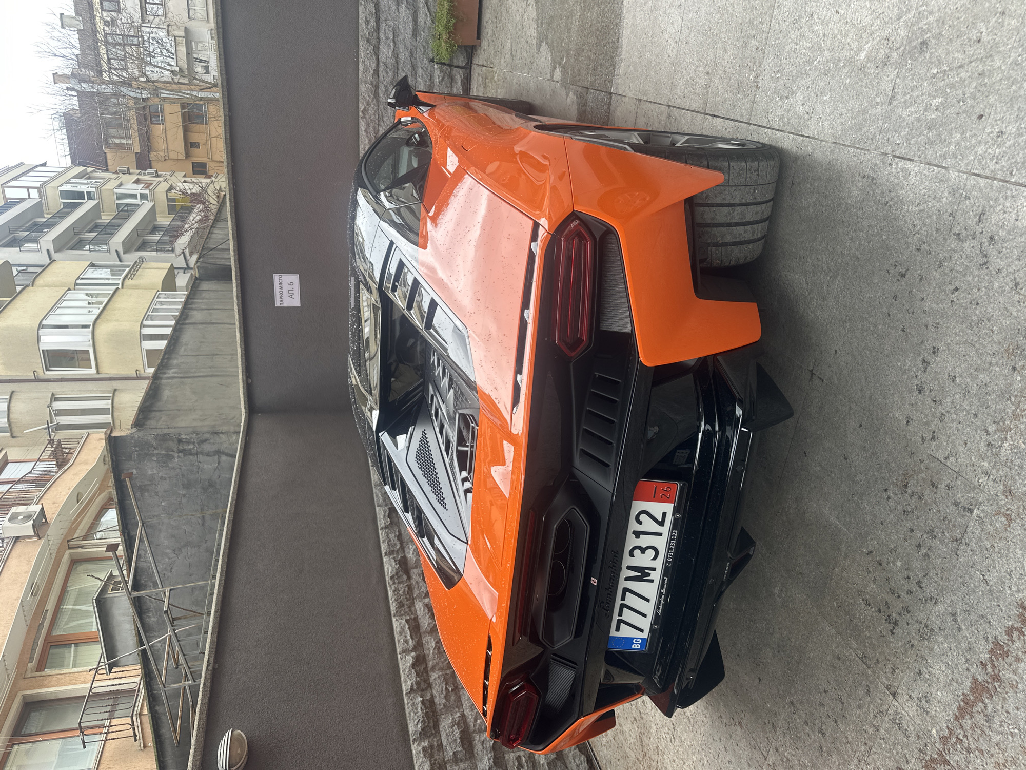 rear of an orange and black Lamborghini supercar parked in a location near an apartment building in Varna, Bulgaria. The car's license plate number is 777M312, registered in Bulgaria ("BG"). The background includes a building with multiple windows and apartments. The weather appears to be overcast, with raindrops visible on the car's surface. A sign with text 'ПАРКО МЯСТО АП. 6' is placed on the wall. The ground is paved with gray stone.