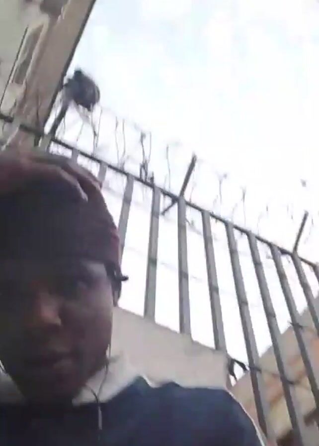 A person wearing a maroon knit cap, a blue collared shirt with white trim, and earbuds stands outside near a metal fence. The person is adjusting their hat with their right hand. The background includes a white building and a cloudy sky. The person is facing the camera and speaking.
