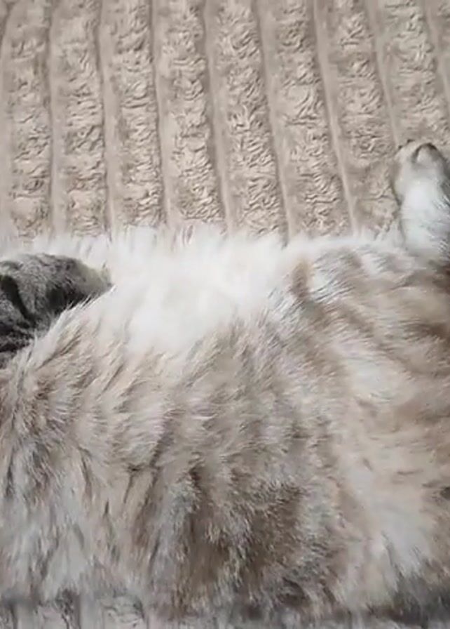- "fluffy, light-colored cat lying on its back on a beige, textured blanket" by FM-pJyc73, licensed under CC BY 4.0