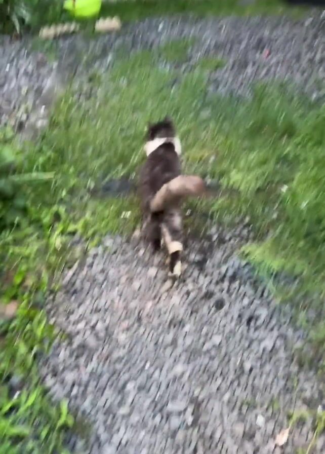 A cat walks away from the viewer across a gravel path. There is grass along the edges of the path. A green bucket can be seen in the background. A hand reaches into the frame to pet the cat. The cat continues walking through the grass.