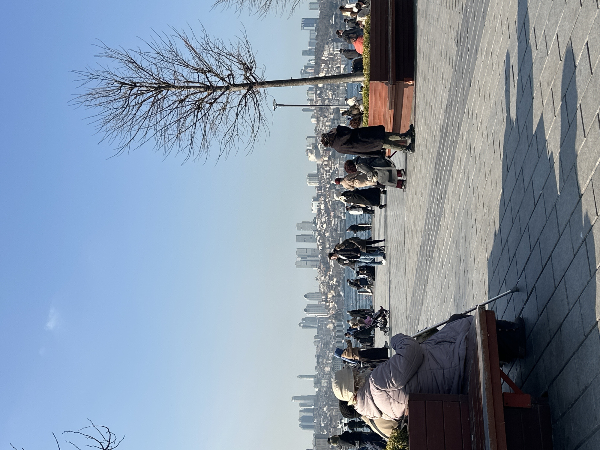The image displays a sunny, clear-weather scene on a paved waterfront promenade in Üsküdar, Turkey. In the left foreground, an individual wearing a light-colored hat and a puffy lavender-grey winter coat is seated on a dark brown wooden bench, with a silver walking stick visible near their right side. The ground is paved with rectangular light grey pavers, showing sharp shadows indicating bright sunlight. The midground features numerous people, a mix of adults and at least one child in a stroller, engaged in walking, standing, and observing. A prominent leafless deciduous tree with sparse branches stands on the right, accompanied by a dark lamppost. Behind the tree, a long, dark brown wooden planter box with integrated seating contains green foliage. Individuals are dressed in various winter coats, with some congregating closer to the water's edge. The background presents the calm blue waters of the Bosphorus Strait, traversed by several vessels. Beyond the water, the dense urban skyline of Istanbul's European side is visible, characterized by numerous high-rise buildings and other structures ascending a hilly landscape, all set against a clear, light blue sky with minimal cloud cover.