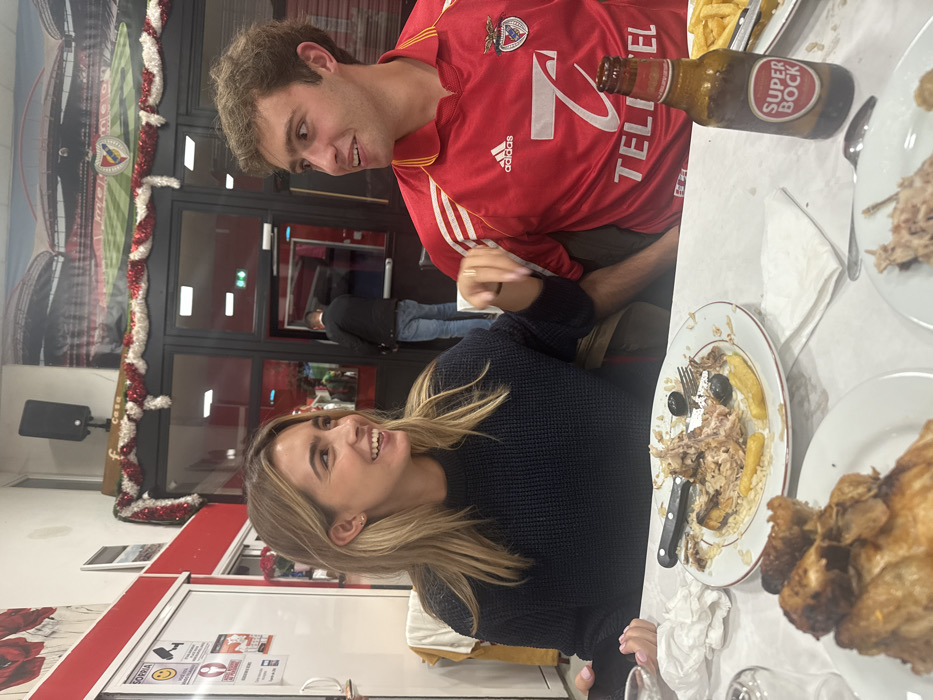The image depicts two individuals seated at a table inside a Portuguese restaurant, likely Casa Portuguesa, located in Décines-Charpieu, France. On the left, a young adult female with long, light brown hair, wearing a dark blue knitted sweater, is smiling broadly and looking towards the male. Her right hand is slightly raised, near the male's arm. On the right, a young adult male with short, curly brown hair wears a red Adidas polo shirt with white stripes, an SL Benfica crest, and a "TELCEL" sponsor logo. He is also smiling and looking at the female. In the background, a third male figure in a dark jacket and blue jeans is visible through a glass door. The white-clothed table features several dishes. In front of the female is a white plate containing remnants of a meal, including shredded chicken, rice, black olives, and fried plantains/potatoes, with a knife and fork resting on it. Another plate in the foreground holds several pieces of roasted chicken. A brown glass bottle of Super Bock beer stands upright on the table to the right, next to a plate with french fries. White paper napkins and a drinking glass are also visible. The restaurant's interior walls are white with red trim. A large banner depicting a football stadium (likely Estádio da Luz) with the SL Benfica crest is displayed on the wall behind the individuals. A red and white tinsel garland is strung across a doorway, above which a black speaker is mounted. A white sign with "SORRIA" (Smile) and a camera icon is visible on a white cabinet/door to the far left.
