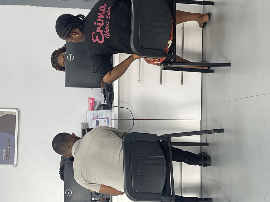 The image depicts an interior scene in the city of Ado, Nigeria, specifically an office or customer service area