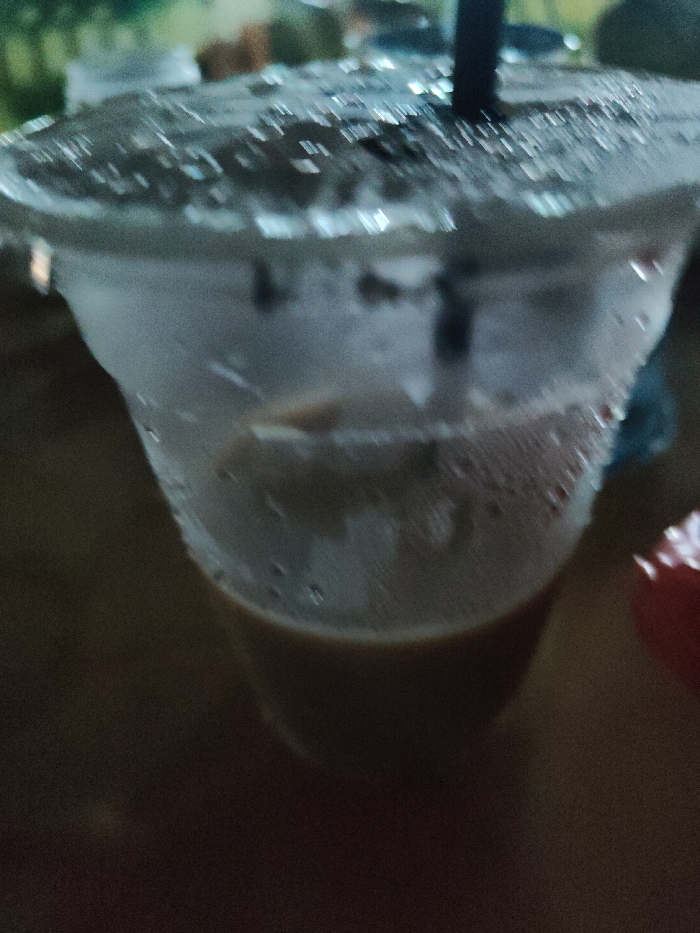 A close-up shot captures a plastic cup filled with a milky brown liquid, likely coffee or tea, with condensation forming on the cup's exterior. A black straw pierces through a clear lid, which is also covered in condensation droplets. The background is dark and indistinct, adding focus to the drink. Part of a blurred, reddish object is on the right.