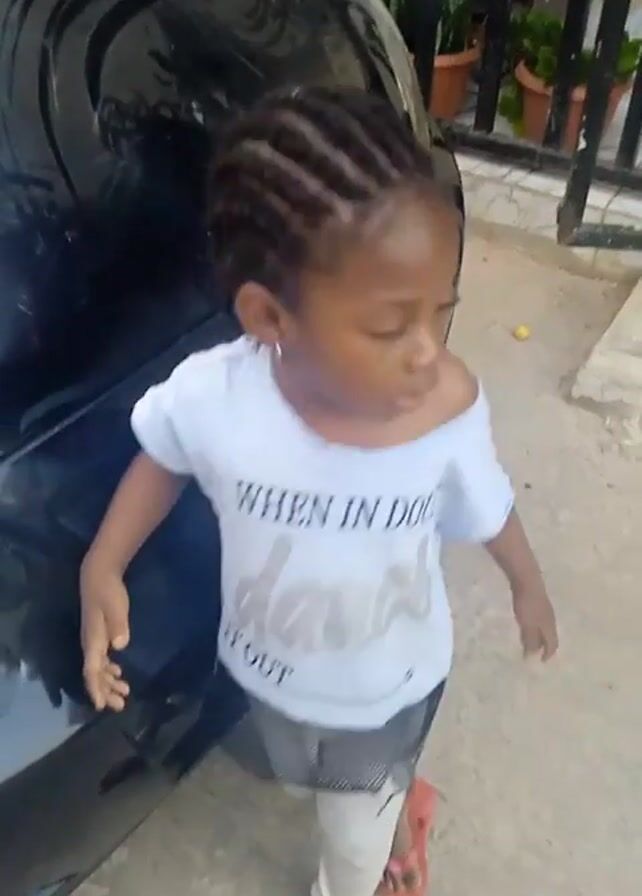 A young girl with braided hair stands next to a black car. She is wearing a light blue t-shirt with the words "WHEN IN DOUBT dance IT OUT" on it, along with a black and white checkered skirt, white leggings, and red sandals. She looks off to the side with a slightly furrowed brow. There are plants in pots behind the car and a fence in the background. The ground is concrete. The video appears to be taken outdoors.
