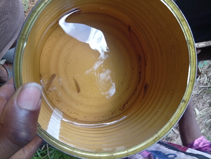 A close-up captures a gold-colored tin can filled with water, in which a few small, pale fish swim. The water is cloudy with sediment. The interior of the can has visible concentric ridges. A hand with dark skin and a thumb nail is partially visible on the left side of the image. Portions of clothing with pink floral prints can also be seen. The lighting suggests an outdoor setting.