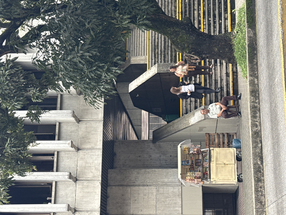 This image captures an urban street scene in Perimetro Urbano Pereira, Colombia, dominated by a large, brutalist-style concrete building. The building features repetitive rectangular windows on its upper floor, separated by vertical concrete fins, and a complex lower structure with angled concrete walls and an entrance accessed by a wide set of stairs. In the foreground, a multi-lane asphalt road with a double yellow line is visible, separated by a concrete curb from the sidewalk area. On the left side of the sidewalk, a cream-colored mobile vendor cart with wheels and a transparent plastic canopy displays various packaged snacks, drinks, and small items for sale on shelves. Adjacent to the cart, an older man with grey hair, wearing a light-colored collared shirt and dark trousers, sits on a dark brown stool, facing slightly towards the right. A blue plastic bag is positioned near the cart's base, and a stack of wooden pallets is visible behind it. Towards the right and mid-ground, a large tree with a thick, moss-covered trunk and dense green foliage partially obscures the building's lower levels and extends upwards beyond the frame. Behind the tree, a wide concrete staircase with yellow safety strips on each step ascends towards the building's entrance. Two women are descending these stairs. The woman on the left wears a white long-sleeved top, a dark open jacket, and dark pants, carrying a dark bag over her left shoulder. The woman on the right wears a light-colored sleeveless top, brown pants, and a light brown wrap around her waist, holding a clear bottle or can in her right hand. Both women appear to be engaged in conversation as they descend.