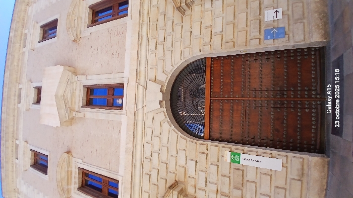 A low-angle exterior photograph depicts the Palacio de la Aduana, which houses the Museo de Málaga, situated on Plaza de la Aduana in Málaga, Spain. The multi-story building features a light-colored, sand-toned stone facade. The lower section displays rusticated stone blocks, above which the facade transitions to a smoother finish. The central feature is a large, arched entrance. It is fitted with a heavy, double-leaf wooden door, extensively studded with numerous dark metal fasteners arranged in horizontal rows. Above the wooden door, within the arch, is a semicircular wrought-iron fanlight featuring radial and scrollwork patterns. Above the entrance, the first floor exhibits several rectangular windows with dark brown wooden frames. These windows are set within elaborate light-colored stone surrounds; one central window includes a small, shallow balcony structure. A small, white, bird-like figurine is positioned within the lower pane of the window located directly above the main entrance. Higher floors feature smaller, less ornate windows. A simple cornice defines the building's roofline against a clear blue sky. To the left of the main entrance, a vertical white sign with a green top band displays a logo and text (likely "Parques y Jardines del Ayuntamiento de Málaga"). To the right of the entrance, two rectangular signs, one blue and one white, each feature a white arrow pointing right. A dark paved surface is visible at the base of the image. No individuals are present. The image was captured on October 23, 2025, at 15:18.