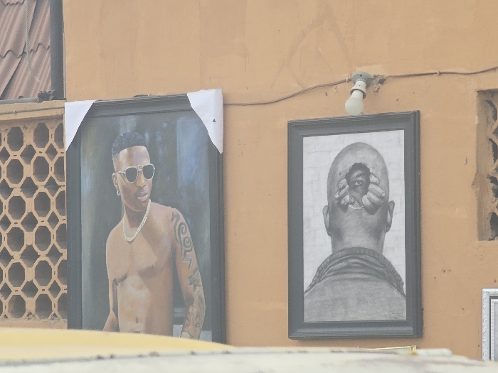 Two framed artworks are displayed outdoors on an orange-brown plastered wall in Agege, Nigeria