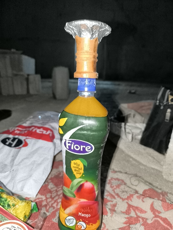 A bottle of Fiore mango juice serves as the base for a makeshift hookah